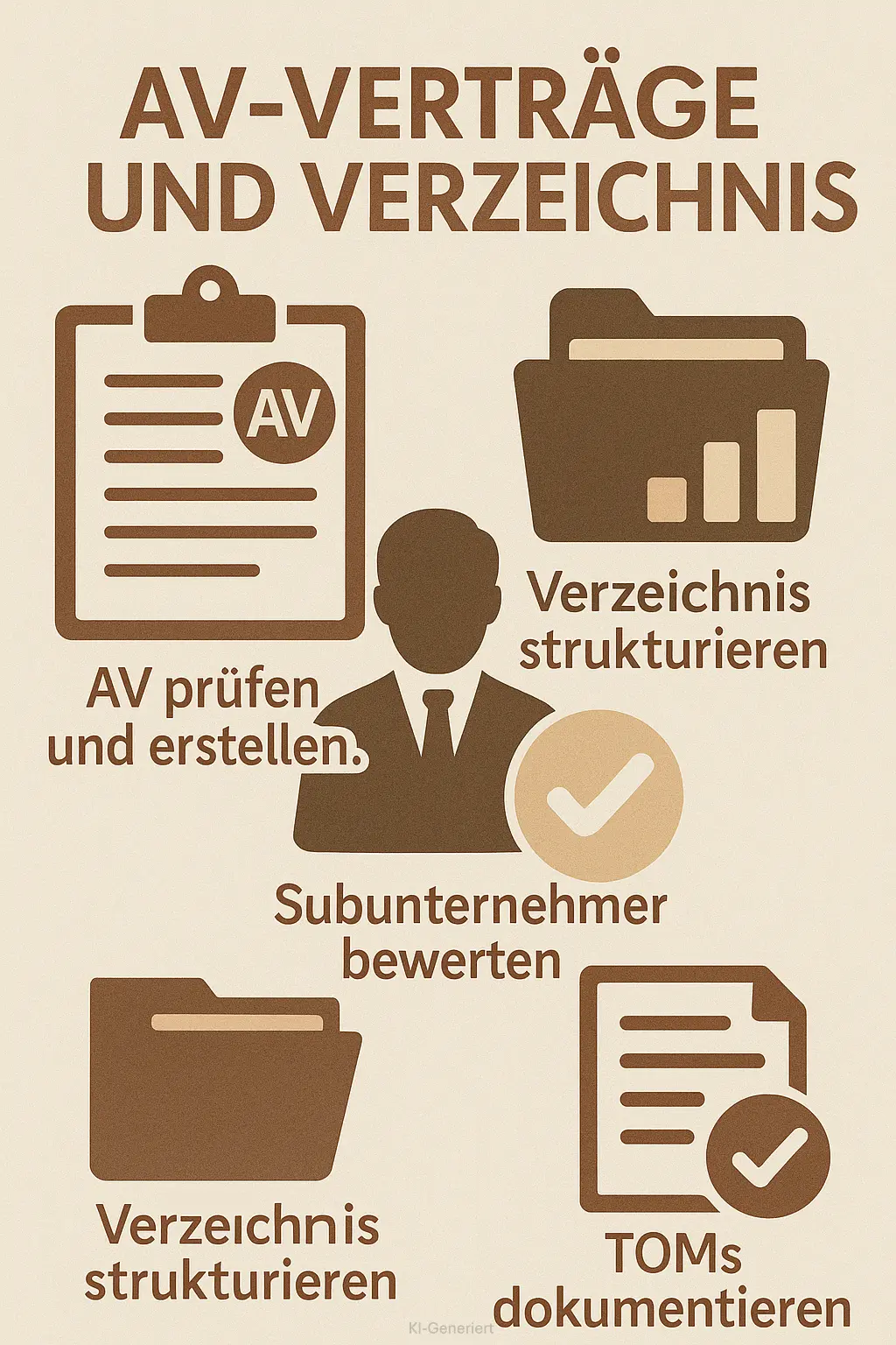 AV prüfen und erstellen. Subunternehmer bewerten. Verzeichnis strukturieren. TOMs dokumentieren.
